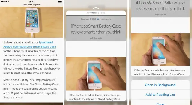 Preview images: You accidentally saw a beautiful picture when browsing the web, you can preview it without distractions, just press it and up pops a clean 3D Touch preview. Swipe up without lifting your finger to Save Image or Copy the URL, or press a little deeper to open that image as a new webpage.